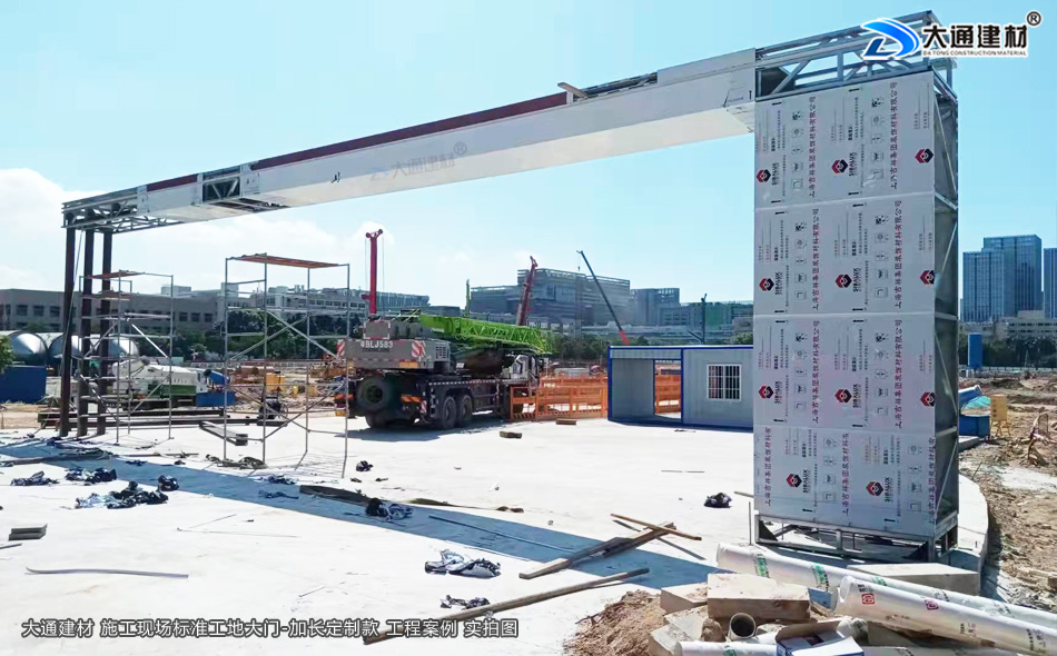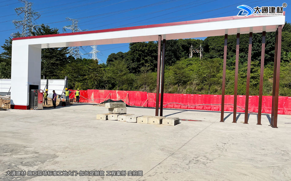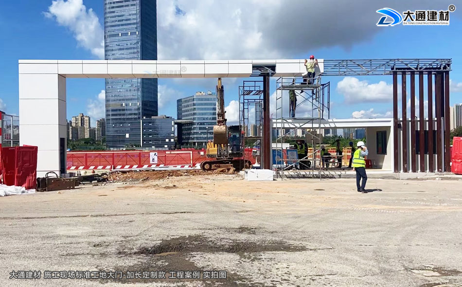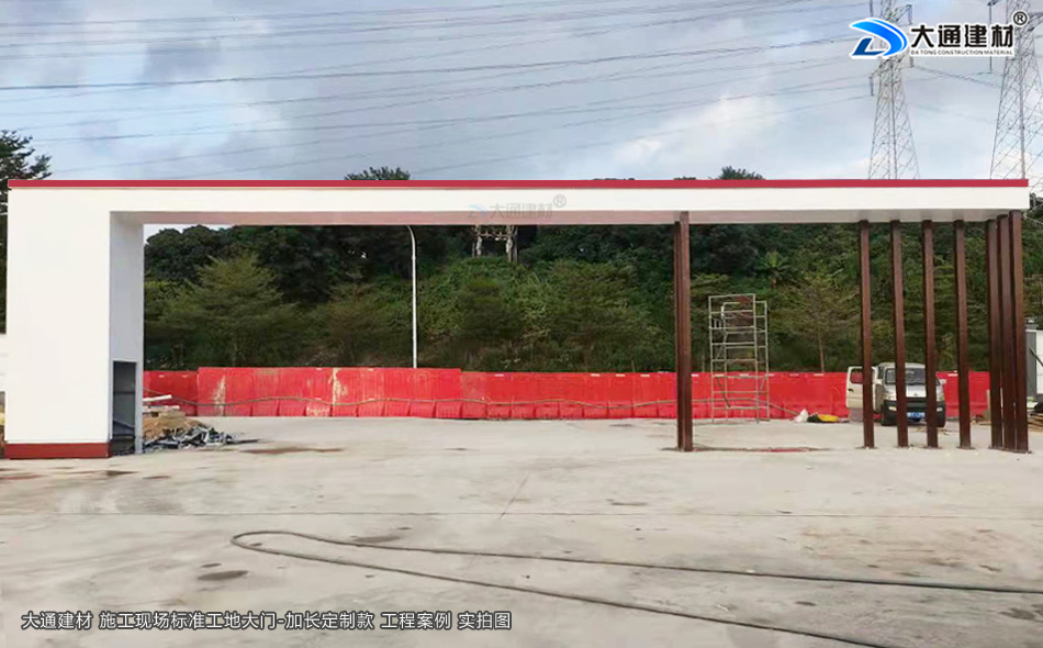 深圳市大通建材有限公司提供標準工地大門生產(chǎn)定制/配送安裝等服務,標準工地大門常規(guī)尺寸為14800mm*5600MM,一些項目工程有特殊需求的可以根據(jù)實際需求進行定制化生產(chǎn),如下面展示的這款鋼結構標準工地大門定制加長款的尺寸是16800mm*5600MM,其它尺寸工地大門有需求的亦可定制化生產(chǎn)。