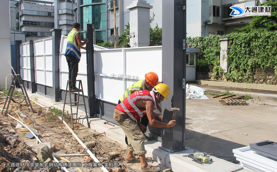 深圳大通建材生產(chǎn)符合惠州市政新標準的惠州圍擋A款,這是一款新型裝配式鋼結(jié)構(gòu)烤漆圍擋,拆裝方便、抗風力強、安全性高,已廣泛應用于惠州各地區(qū)的房地產(chǎn)建設工程項目中。