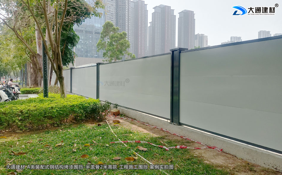 深圳大通建材生產的2米1高A類裝配式烤漆鋼圍擋半龍骨款 適用于各種項目工程:如市政工程建設施工、房地產項目建設施工、地鐵修建項目施工、管網改造、小區改造、城市建設、道路修建施工等工程修施工外圍使用