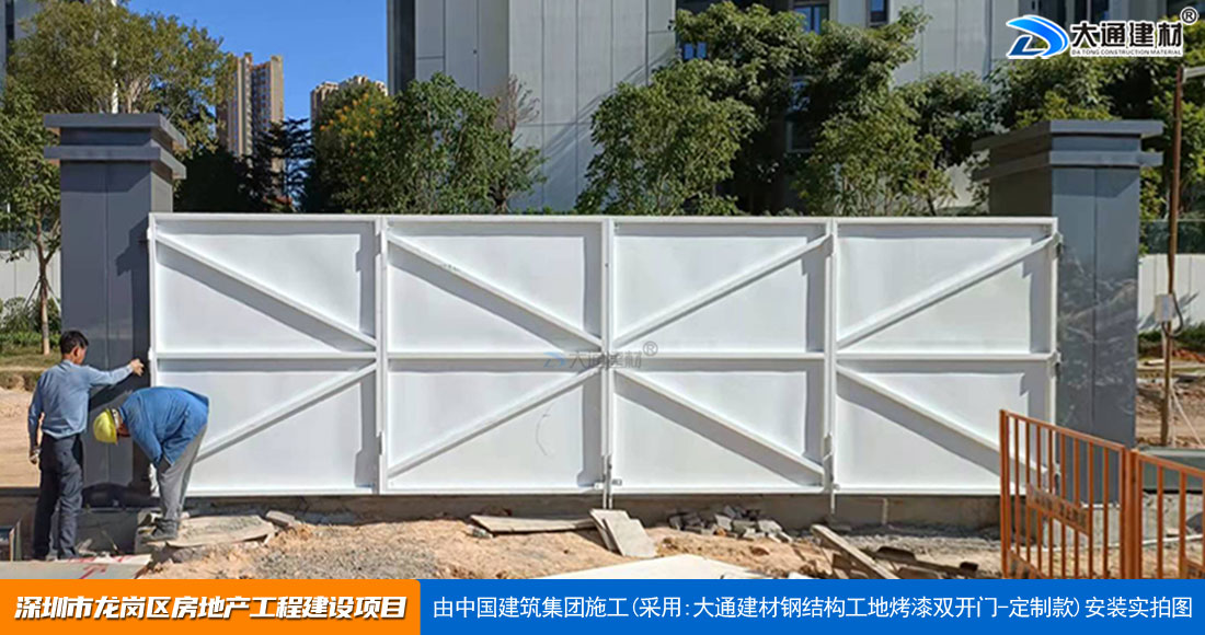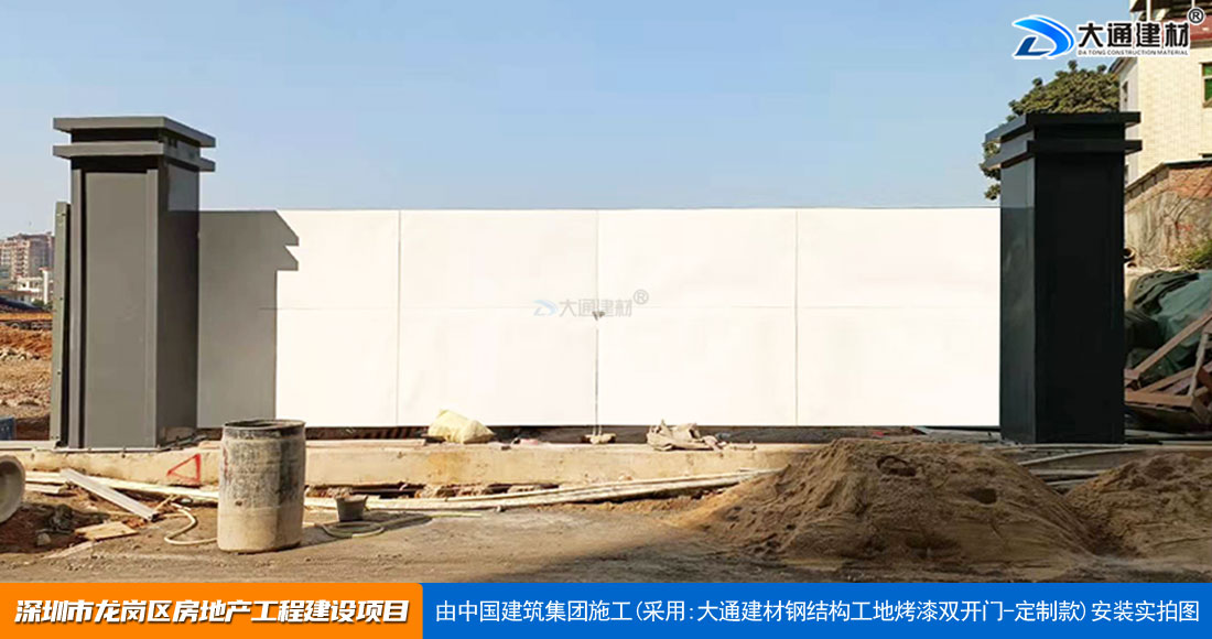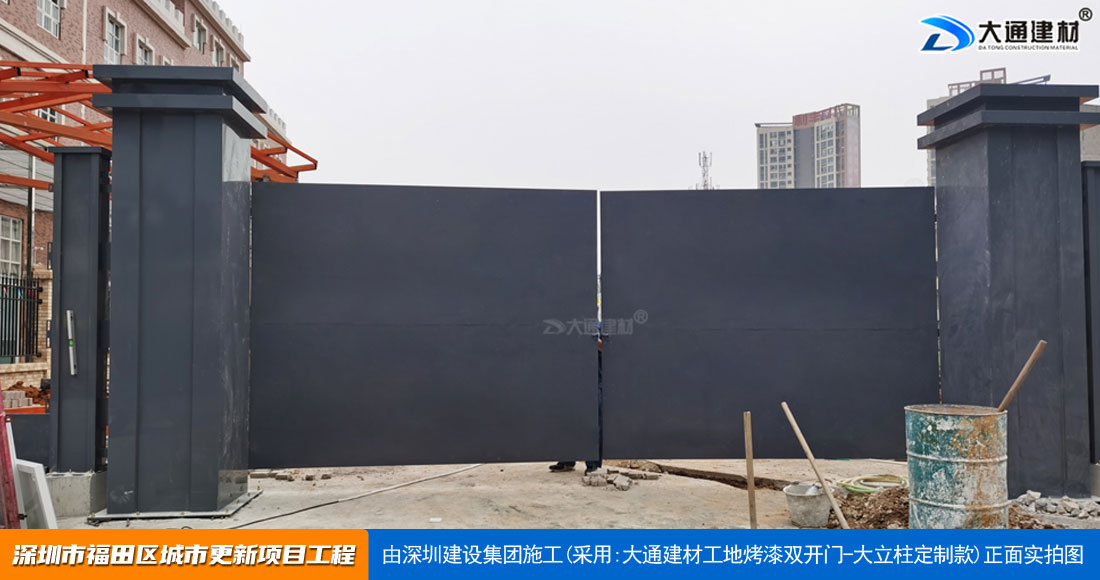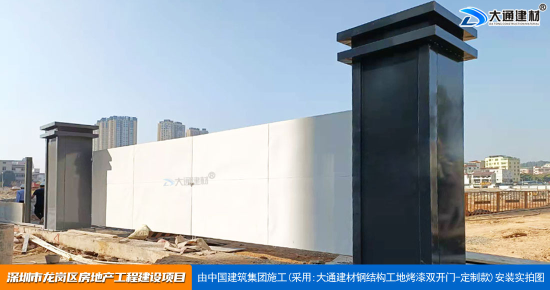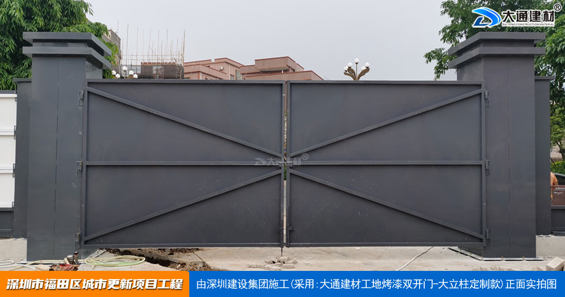 深圳大通建材生產銷售的工地烤漆雙開門-鋼結構工地大門適用于各種市政工程項目、房地產項目、地鐵修建項目施工、管網改造、小區改造、城市建設、道路修建等工程項目使用