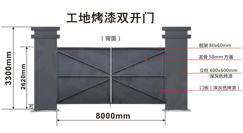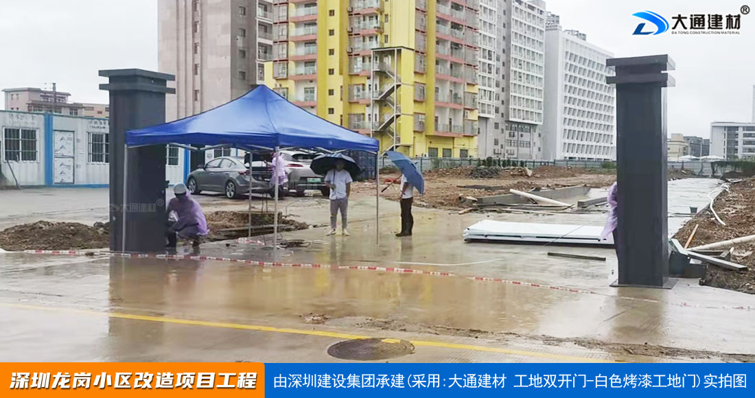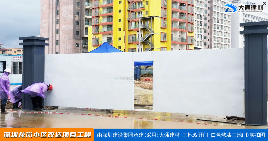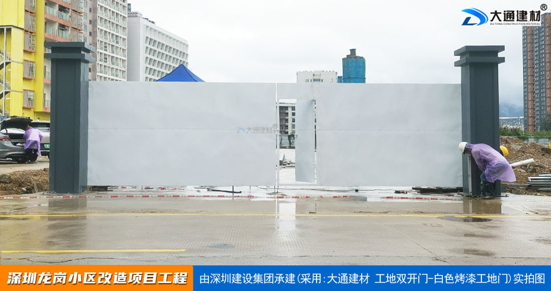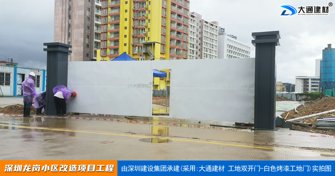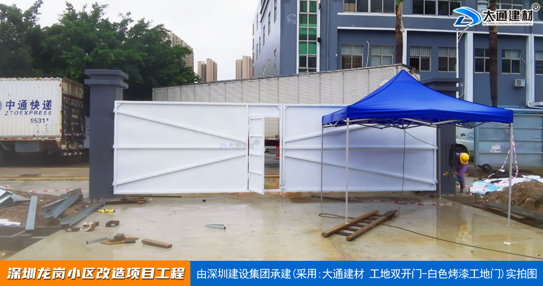 深圳大通建材生產銷售的工地烤漆雙開門-鋼結構工地大門適用于各種市政工程項目、房地產項目、地鐵修建項目施工、管網改造、小區改造、城市建設、道路修建等工程項目使用