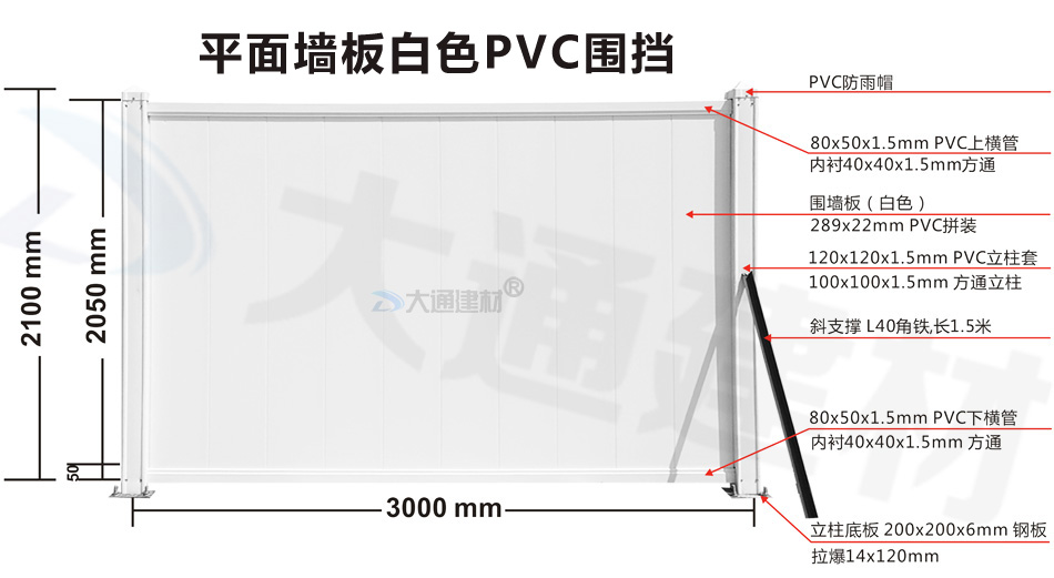 深圳市大通建材新型市政標準平面墻板PVC圍擋快速安裝、標準化快速拼裝:立柱(立柱底板)、上下橫管、斜支撐和橫撐加強筋等部件尺寸與工藝實現標準化生產和標準化拼接安裝,從而達到高效率生產、快速運輸和拼接式安裝,大大降低了圍擋的采購成本。